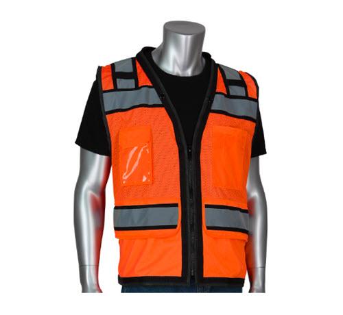 PIP ANSI Type R Class 2 Black Two-Tone Eleven Pocket Tech-Ready Mesh Surveyors Vest w/ D-Ring Access / Hi-Vis Orange - XL